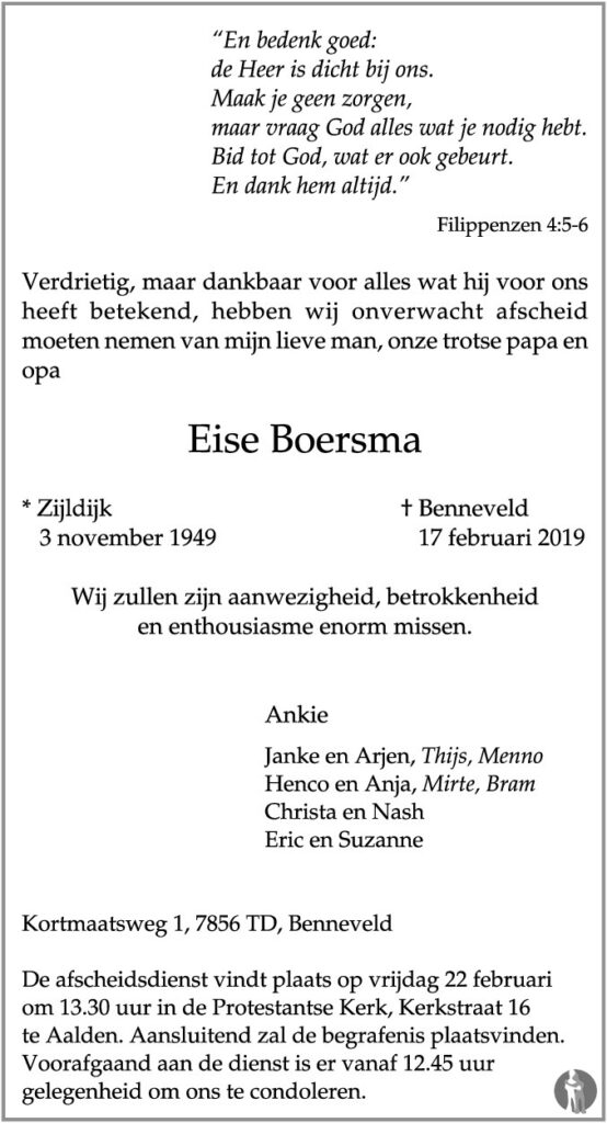 Eise Boersma is op zondag 17 februari 2019 plotseling overleden. Boersma fokte succesvol Welsh B-pony’s onder de stalnaam Gelpenberg’s. Hij was een zeer betrokken lid van het stamboek en onder meer voorzitter van fokvereniging De Kanaalstreek.
