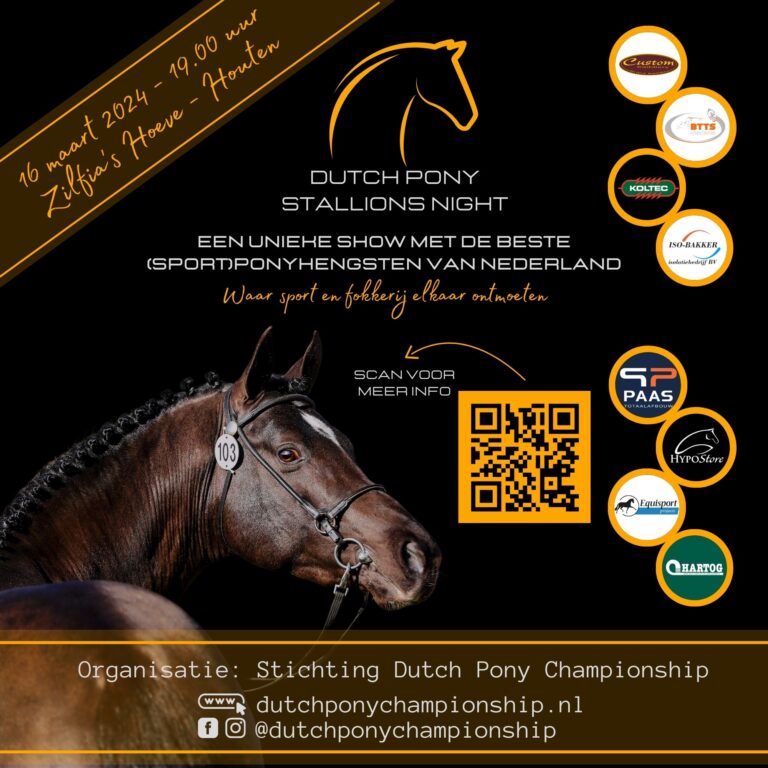 Na een daverende eerste editie van de DPC Stallions Night, de eerste hengstenshow die zich écht op pony’s richt, wordt deze gave avond in 2024 herhaald. Op zaterdag 16 maart is Zilfia’s Hoeve in Houten wederom de locatie voor deze show.