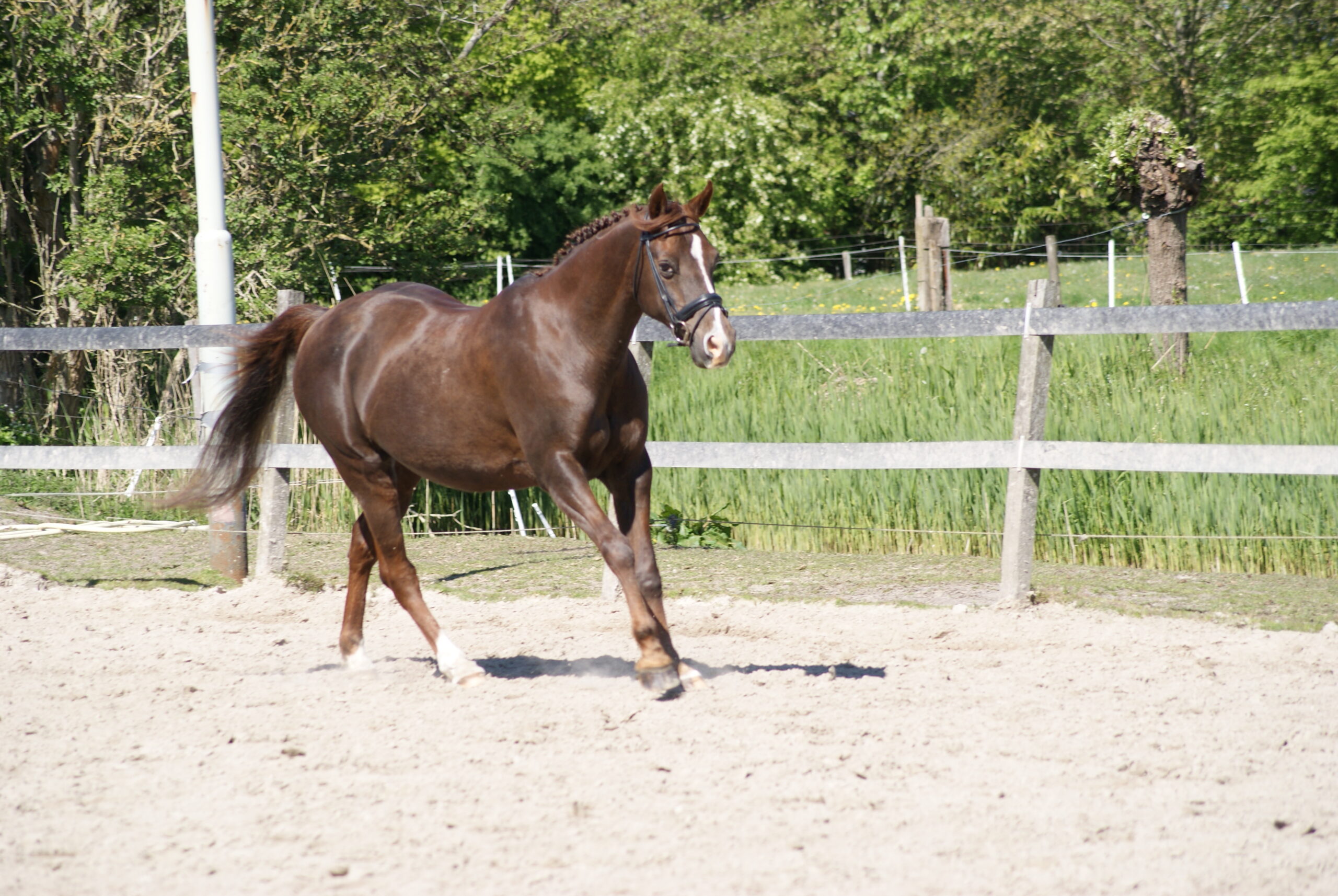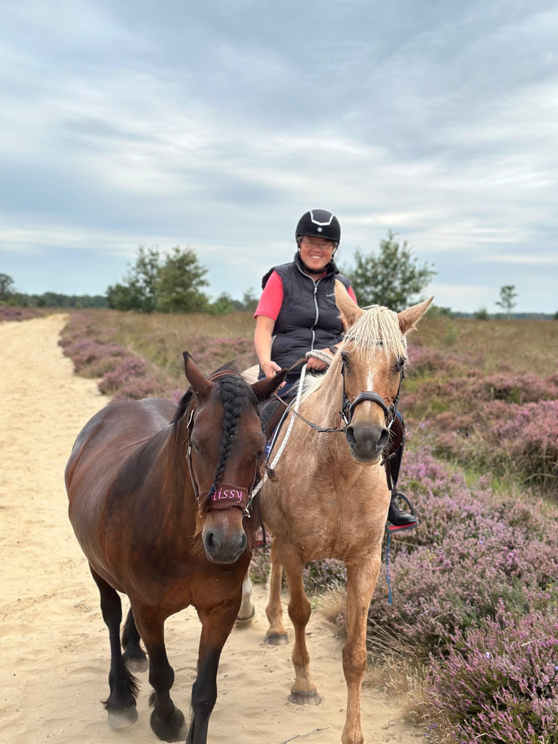 Kimberly hebben wij sinds de zomer, eigenlijk was ze op proef voor een meisje uit het dorp. Maar die vonden haar te oud. Daardoor heb ik haar eens meegenomen naar buiten. Dat klikte zo goed, na een zware operatie dit jaar en enkele jaren niet meer gereden te hebben gaf Kimberly mij weer vertouwen om te kunnen genieten van het buiten rijden. Op de feestavond j.l. werd ze officieel van ons. Nu mag ze lekker genieten van haar pensioen en kan ik heerlijk genieten van haar !