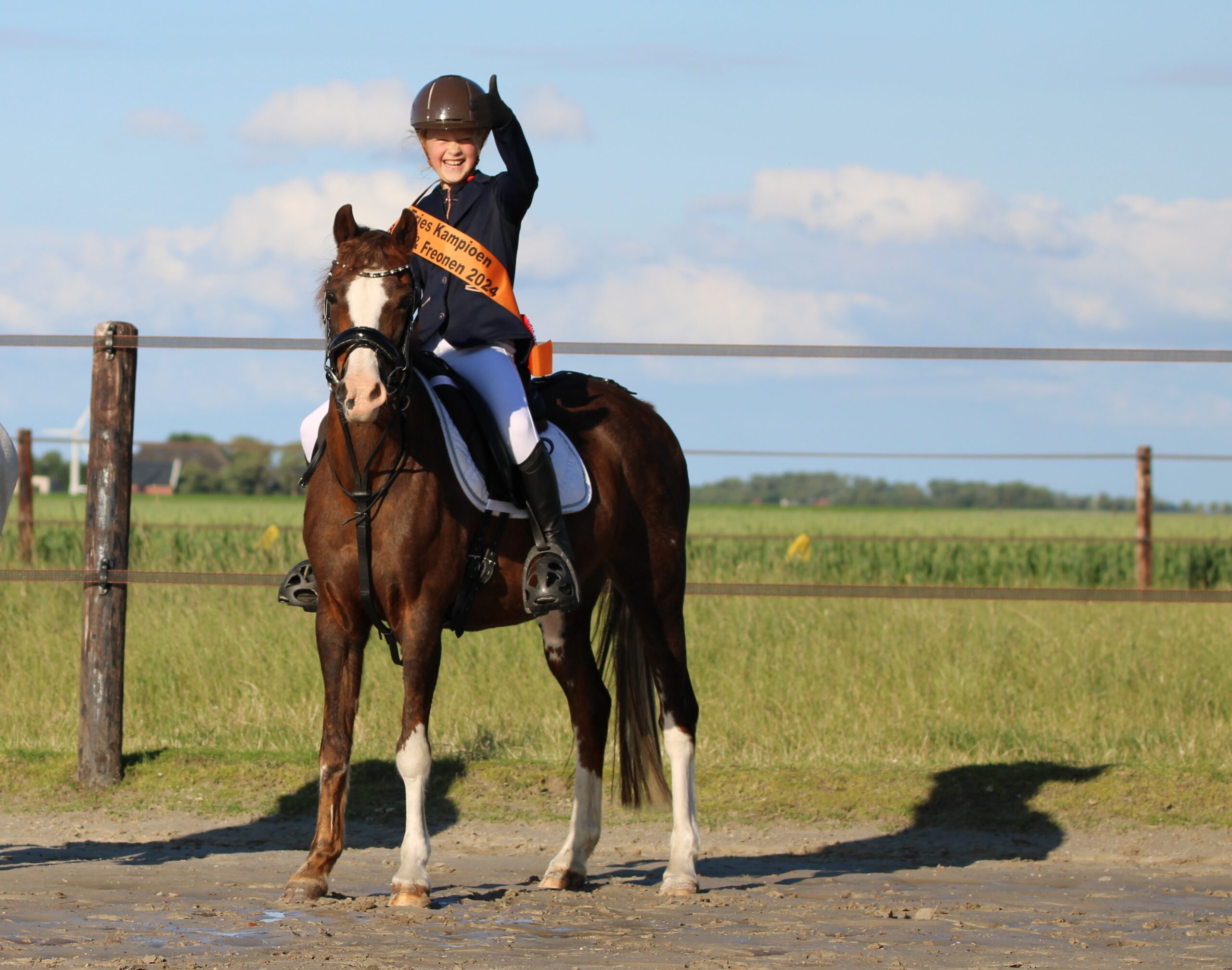 Wij hebben de leukste, maar ook de liefste oude Welsh. Gelpenberg’s Sarina is nu 24 jaar en is afgelopen zomer, samen met onze 8 jarige dochter Tessa, Fries kampioen bixie geworden. Sarina heeft natuurlijk qua fokkerij al een flinke staat van verdienste, maar als pony voor onze dochter doet ze er nog een schepje bovenop. Als deze verkiezing om de leeftijd met bijbehorend gedrag gaat, wint ze het niet, want ze gedraagt zich vaak nog als een hele jonge en snelle pony. We zijn de eigenaar eeuwig dankbaar dat we Sarina hier op stal mogen hebben en hopen op deze manier zowel Sarina als Richard een beetje in het zonnetje te kunnen zetten.